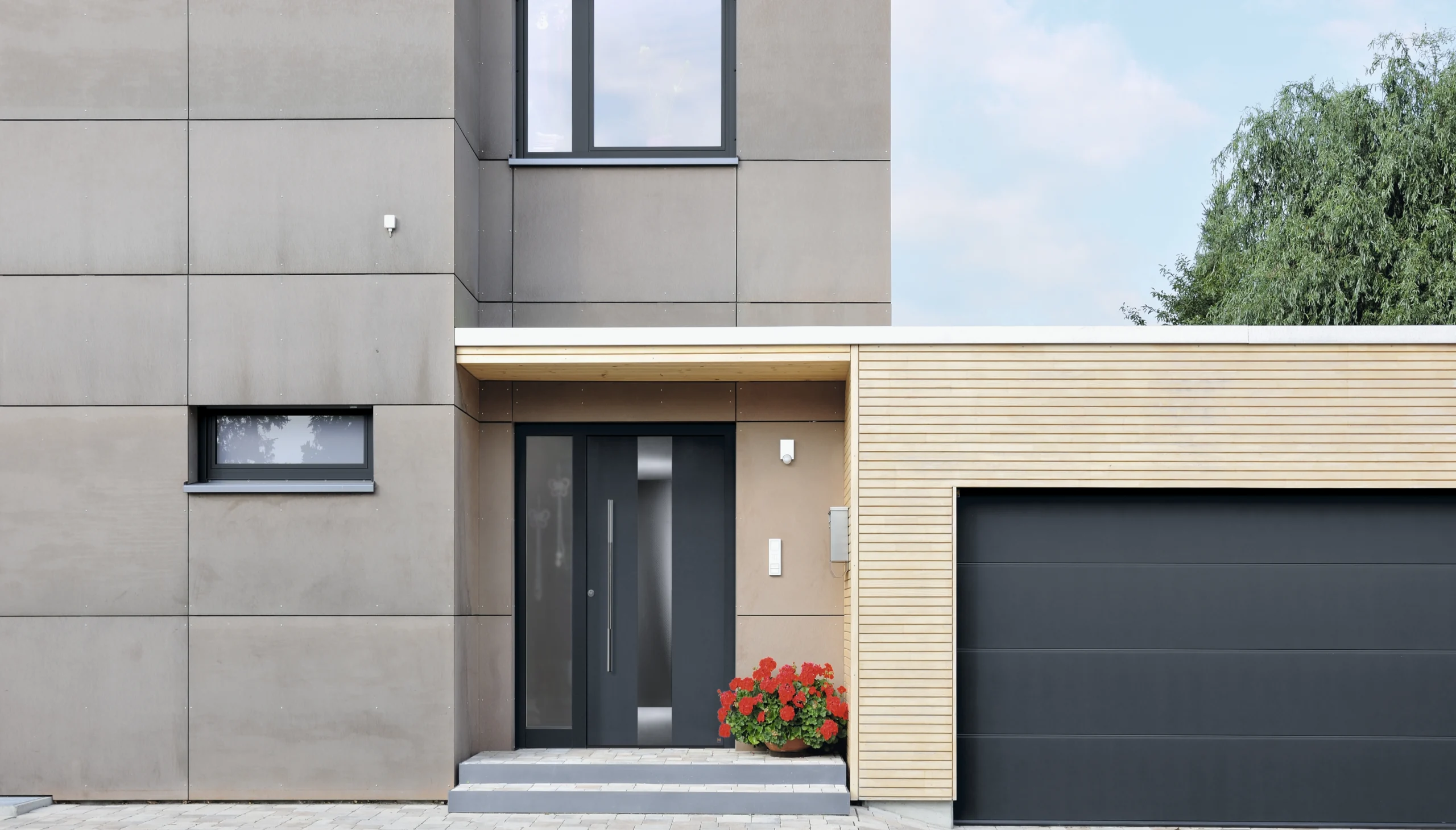 Egy elegáns családi ház, ahol a Hörmann ajtók és garázskapuk harmonikusan illeszkednek a modern homlokzathoz.